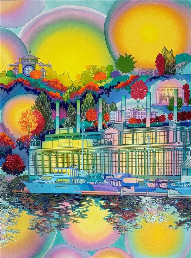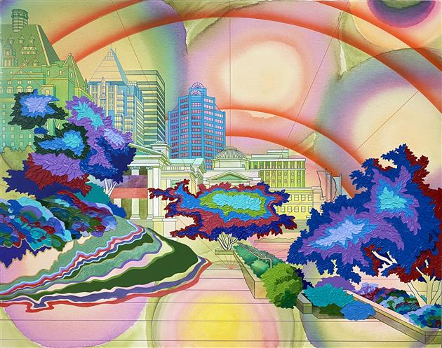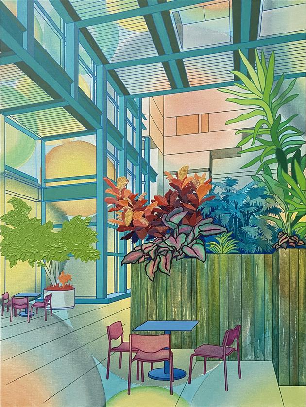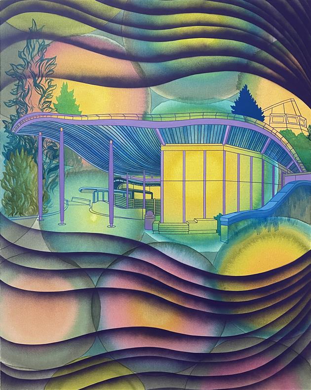 I draw imagery from personal experience and travel. Each painting is an architectural vignette exploring relationships between natural and built environments, architecture and advertising, urban development and existing structures, public space and private experience, as well as organic and hard-edge forms. My work strives to balance a sense of beauty and critique of our growing urban environments.