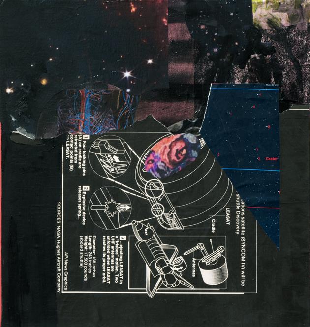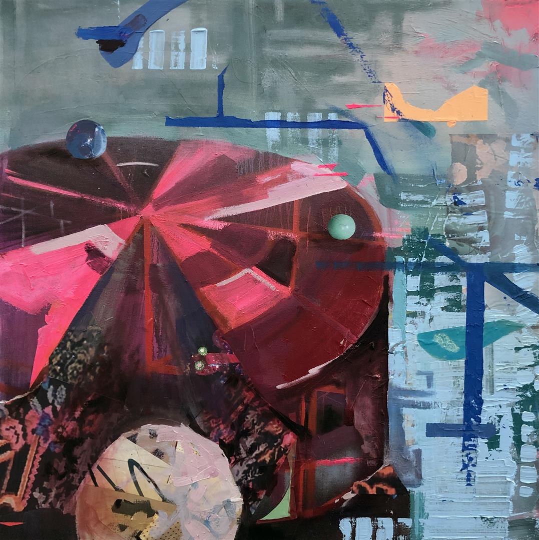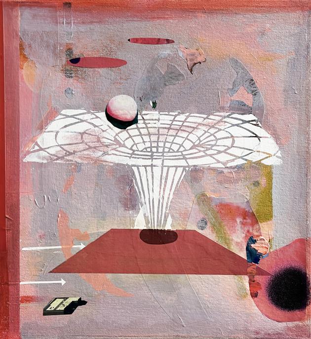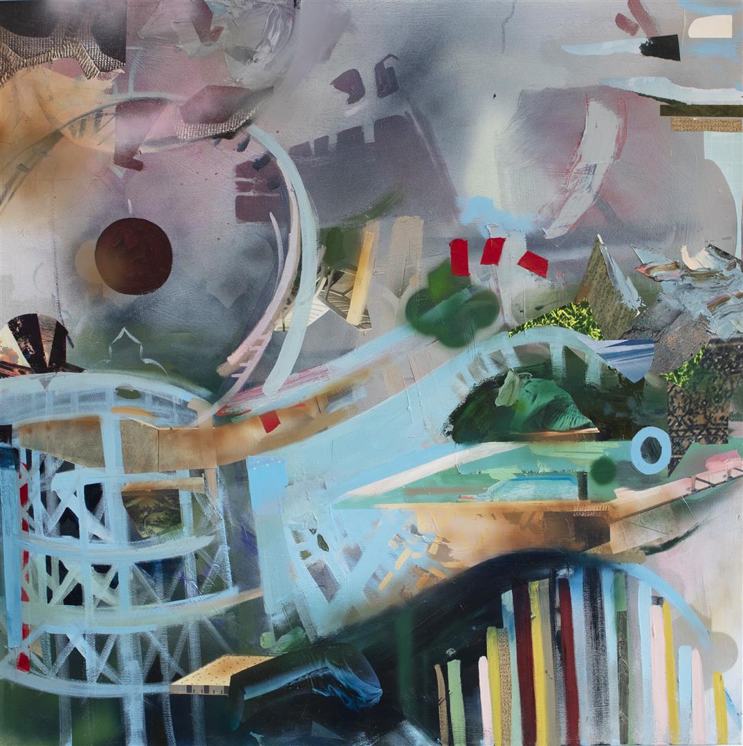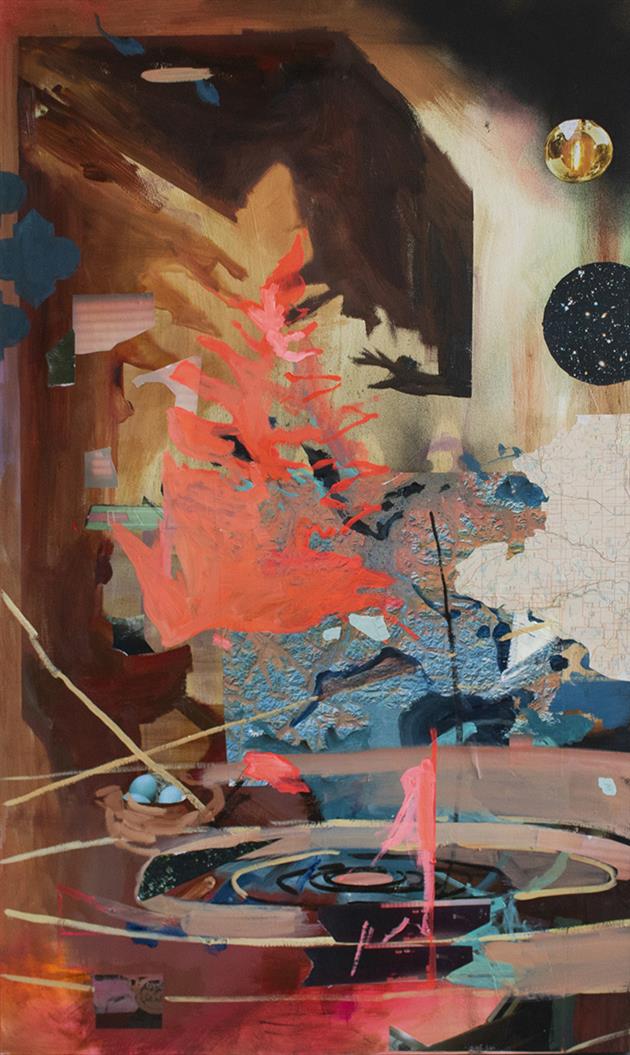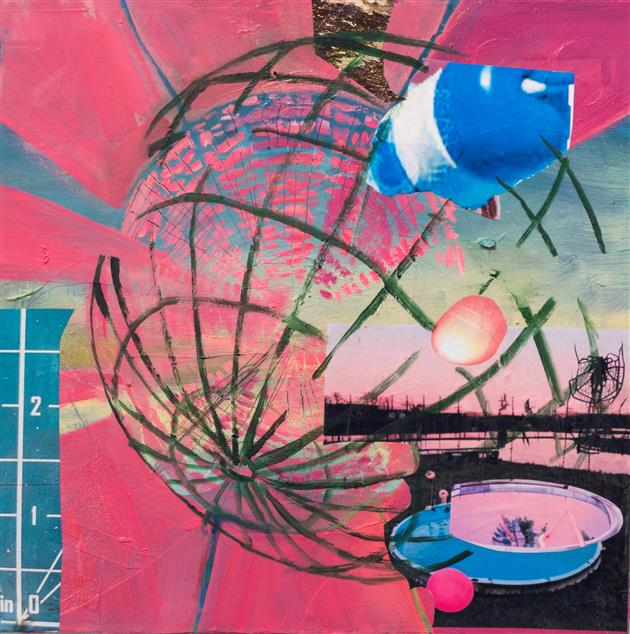 As a 2-D mixed media artist and painter, I use paint and collaged photographic imagery as a means to think through the larger questions, curiosities and areas of subjectivity that makes up our world. My work depicts the universe as a flexible space that is ever-expanding, collapsing, and colliding; along with our understanding of it. I often bring familiar subjects such as swimming pools, birds nests and lawn chairs in conversation with overarching mechanisms that make up our world, such as galaxies, orbital pathways and physics diagrams. These elements coalesce on the surface of the canvas in a way that straddles representation and abstraction, prompting the viewer to reconsider our relationship to the known world and opening up new ways of seeing and understanding our place within it. At its core, I create as a way to connect with the world beyond myself, and to visualize what it means to be a human in our current, and increasingly complex world.
