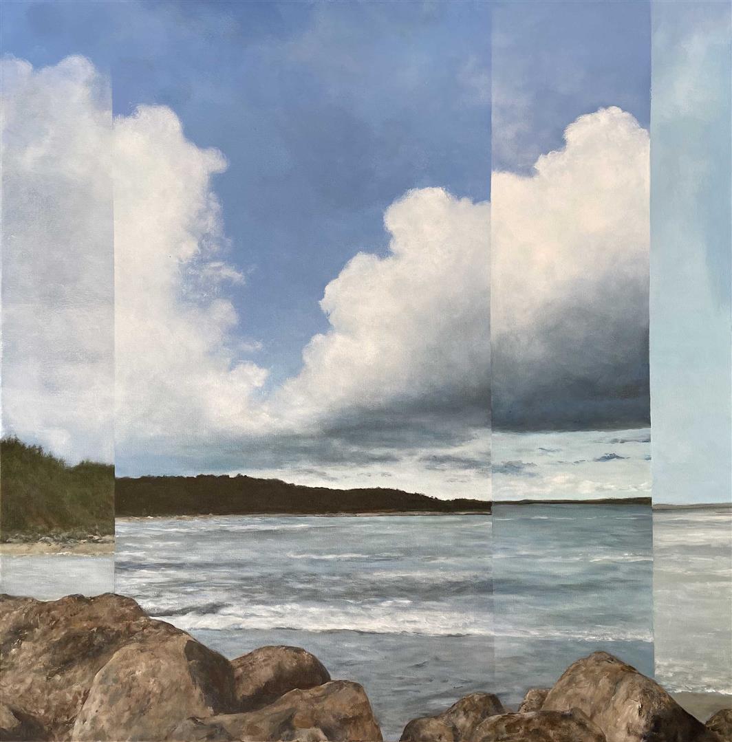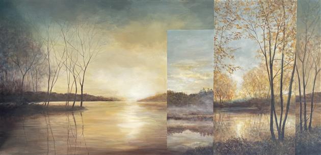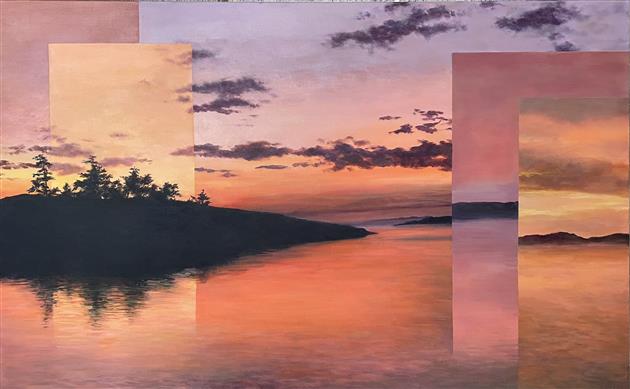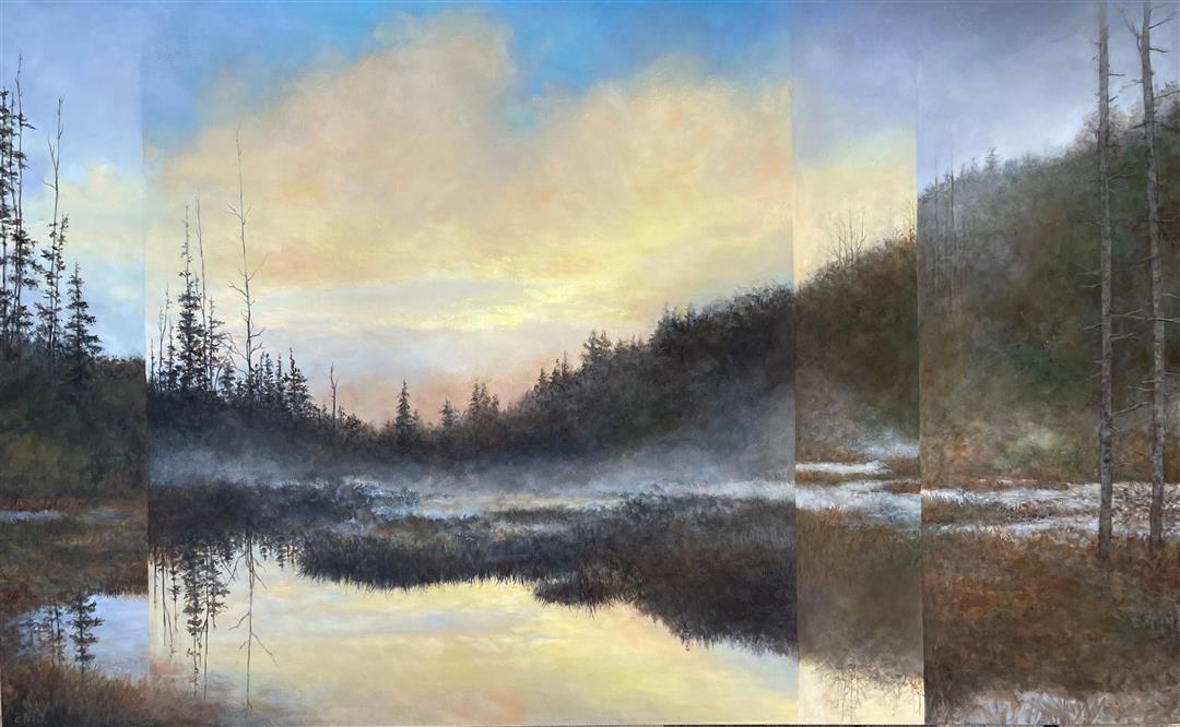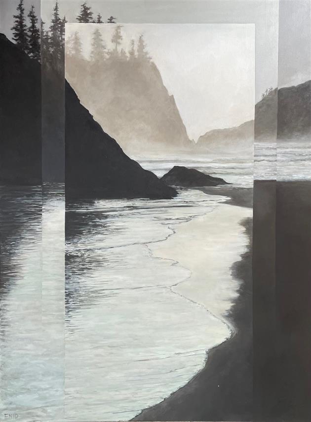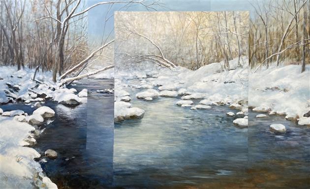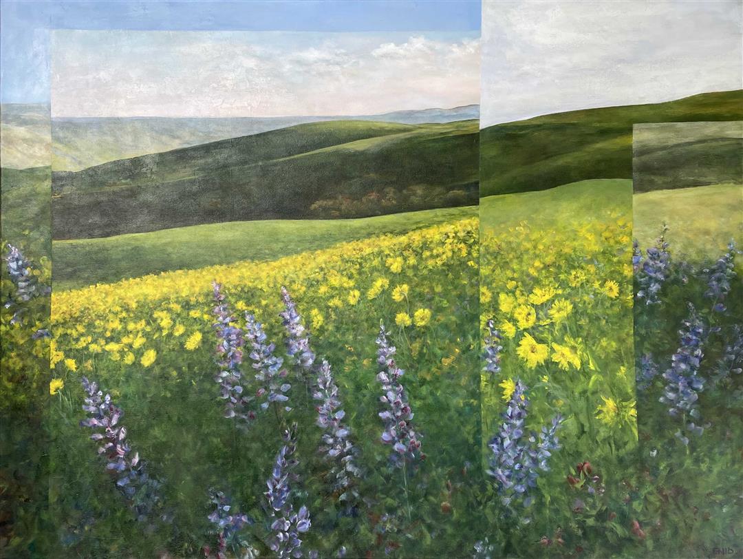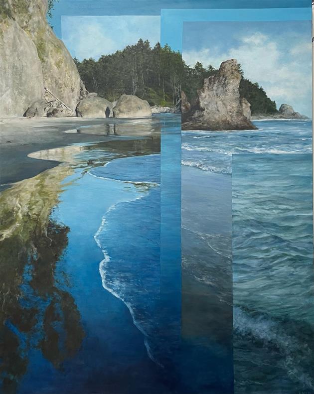 We are all a product of landscape. My goal is to make the universal personal through the creation of places for the eye and heart to travel. At a time where the environment is threatened there is a pressing imperative to find a common vocabulary, to create a reminder of the solace often found in nature. My work, semi-abstracted landscapes, depicts multiple layered views of the environment in a single space. The sharp edges of the interior panels represent the human perspective, the geometric meshing with the organic, humans responding to nature in a constantly changing dialogue. These divisions reflect how we interact with the world around us on a daily basis, through the lenses of time, space and scale as we frame our experience though the screen of a mobile device. I paint in acrylic on canvas.