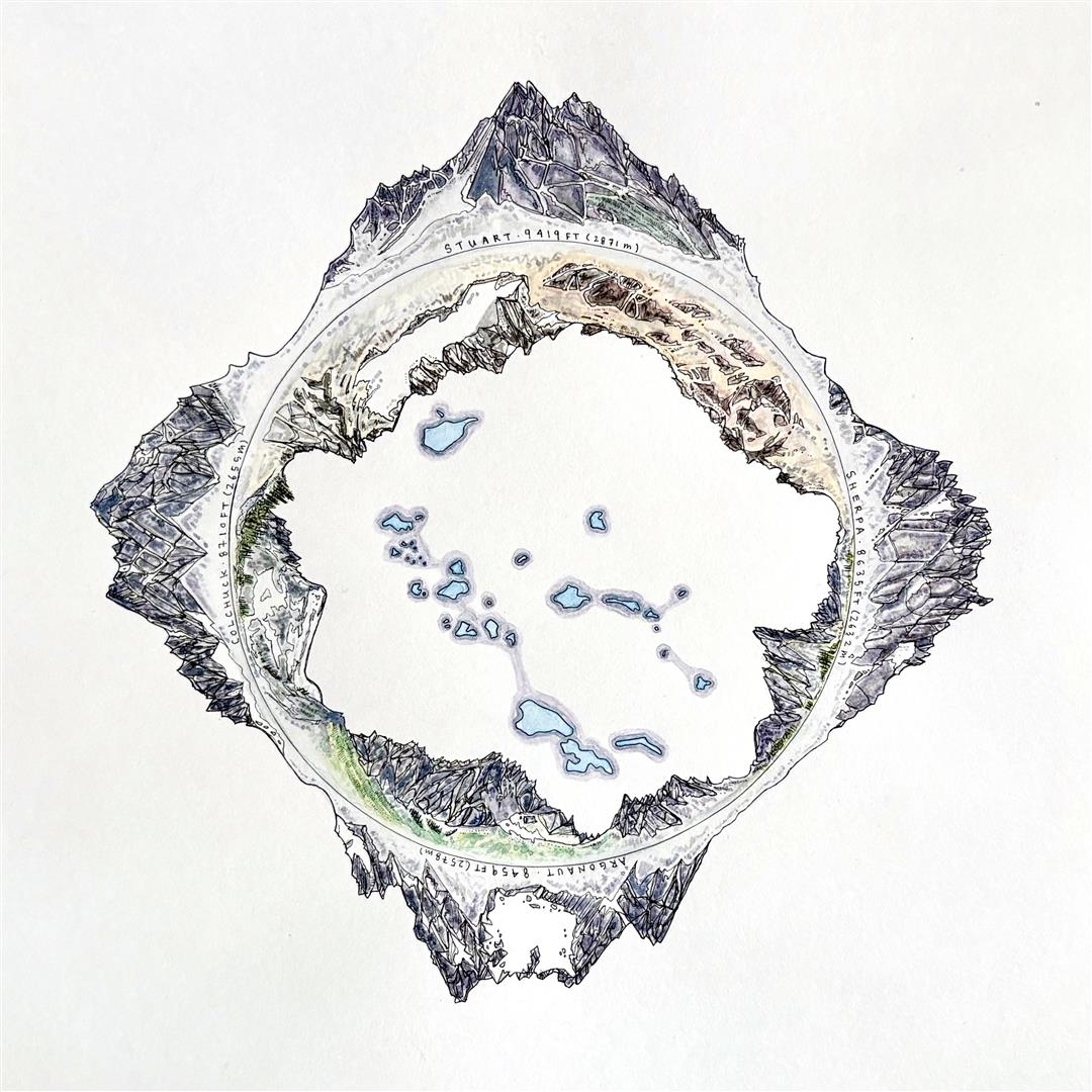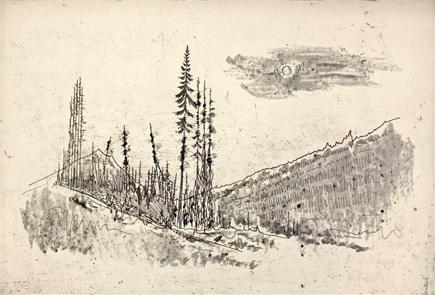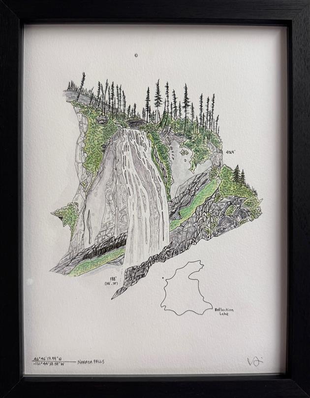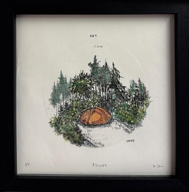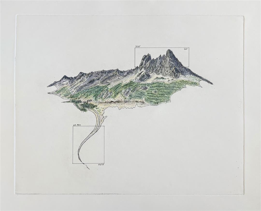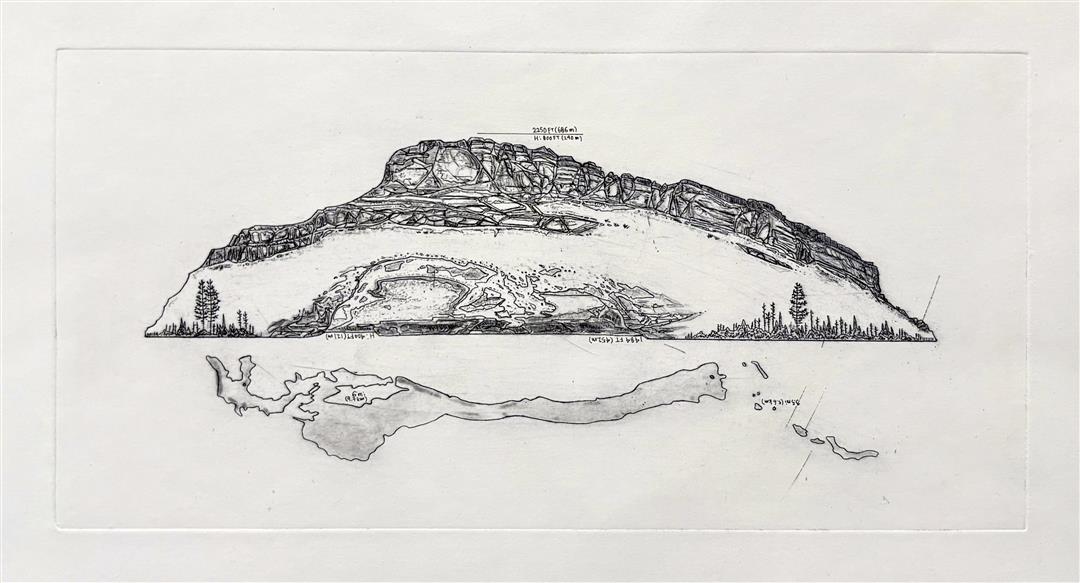 Minami is drawn to lines in landscapes, this is present as a strong feature in her works. Lines are why she pursued intaglio printmaking and etching, where the images are created by drawing on a metal plate with a fine needle. Having grown up in multiple countries, the relationship of memory and intimate personal experience in shaping one's perspective has always interested her. Minami loves maps and the notion of mapping often takes place in her works. She does this by annotating them with details such as coordinates, elevation, distance of the journey, etc.