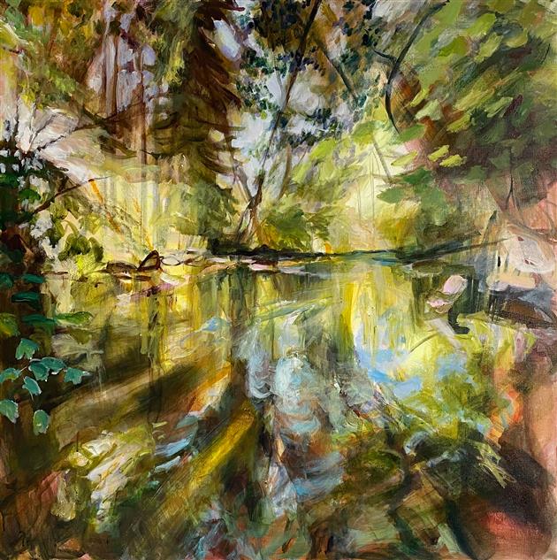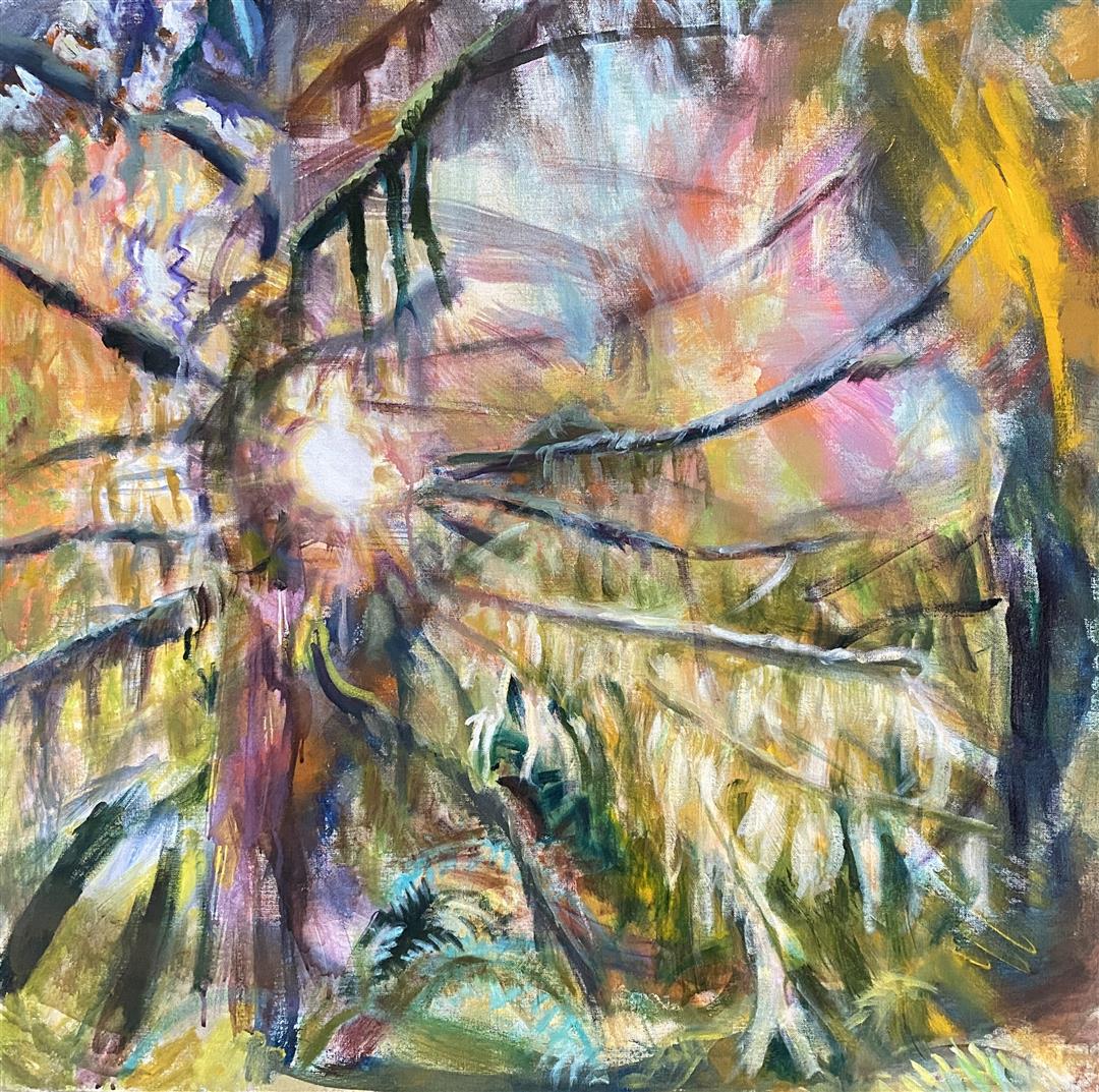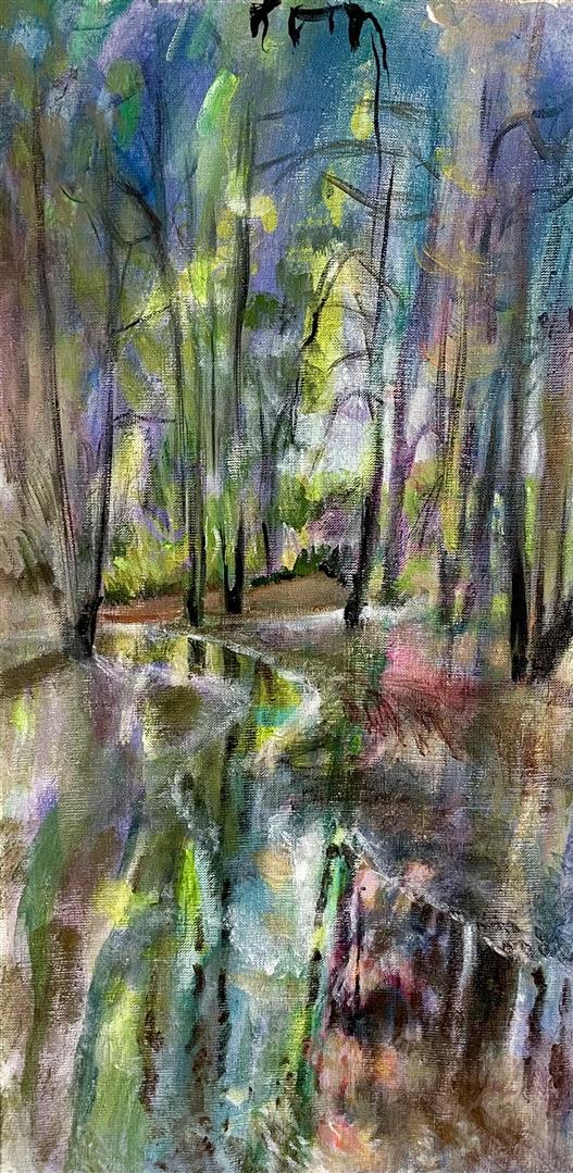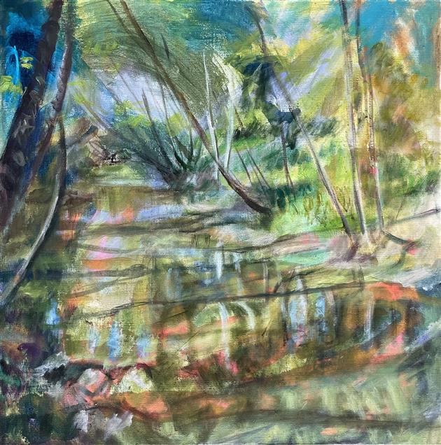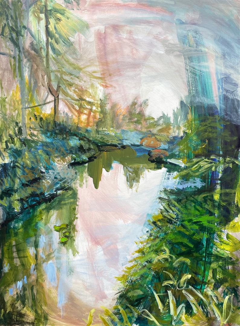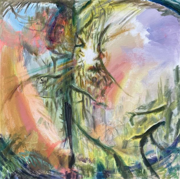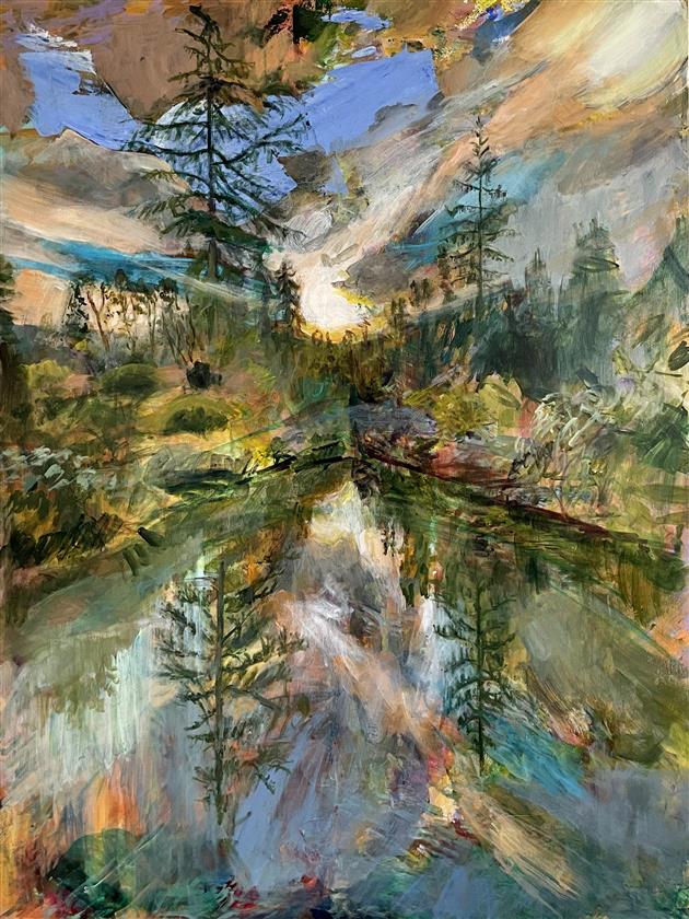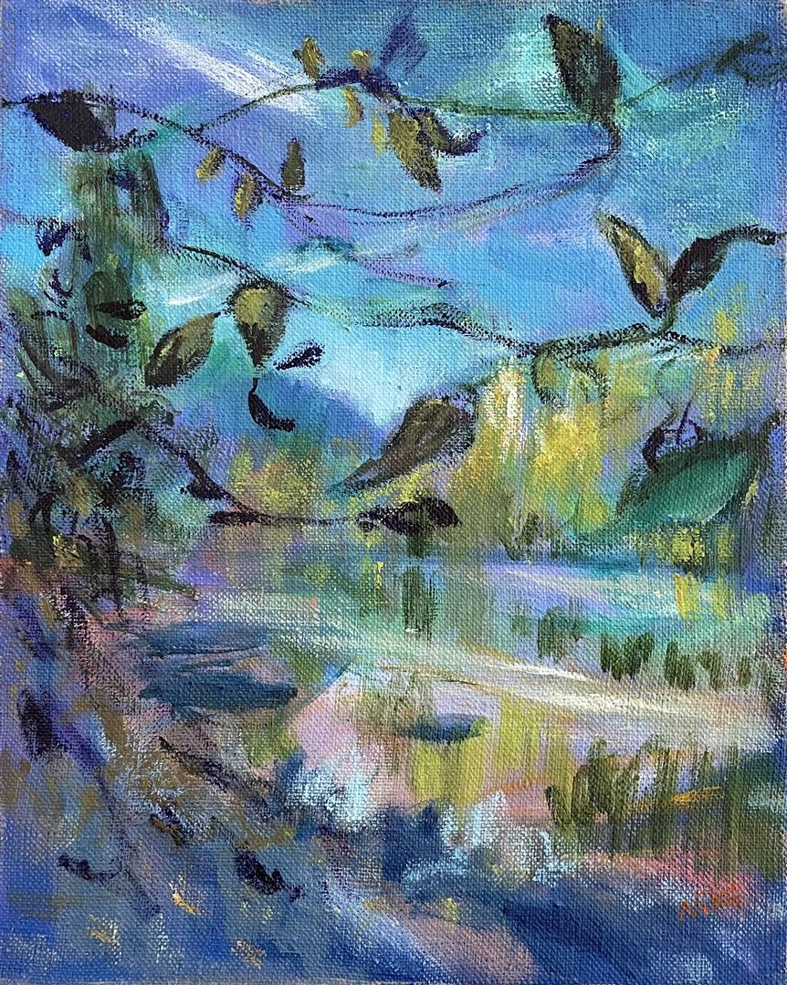 My paintings are derived from images of my backyard or nearby PNW forests and waterways made whimsical through the filter of my mind and memory. I'm constantly adding to the collection of personal sun-soaked moments that arrest me upon encounter and, as I tend to them in my studio, I aim to capture that pause and extend it. The more my landscapes look like a projection of a segment of a dream, the more a sense of time is infused in the canvas. I approach this with fantasy-based color combinations and specific mark-making. With blurred edges and suggestive forms, my pieces take on an abstracted quality that allows for time and gives space to dreams.