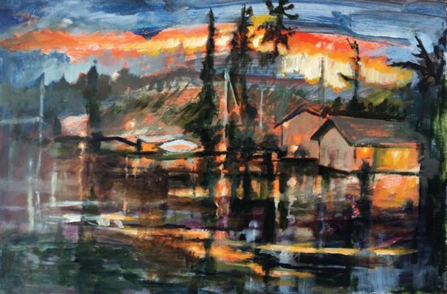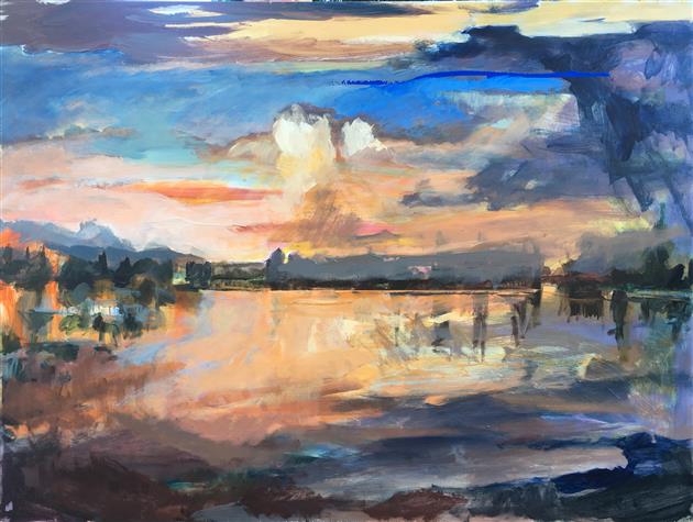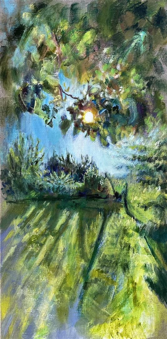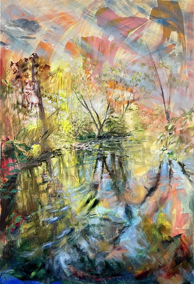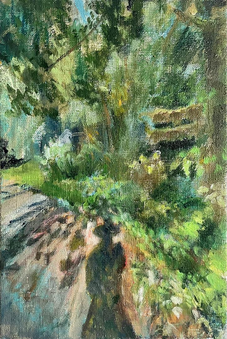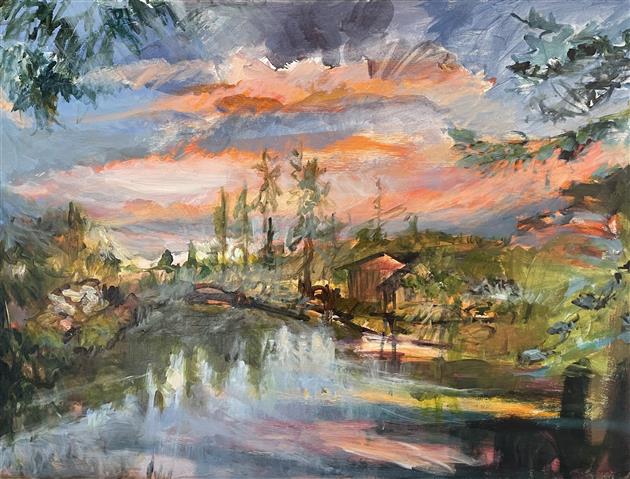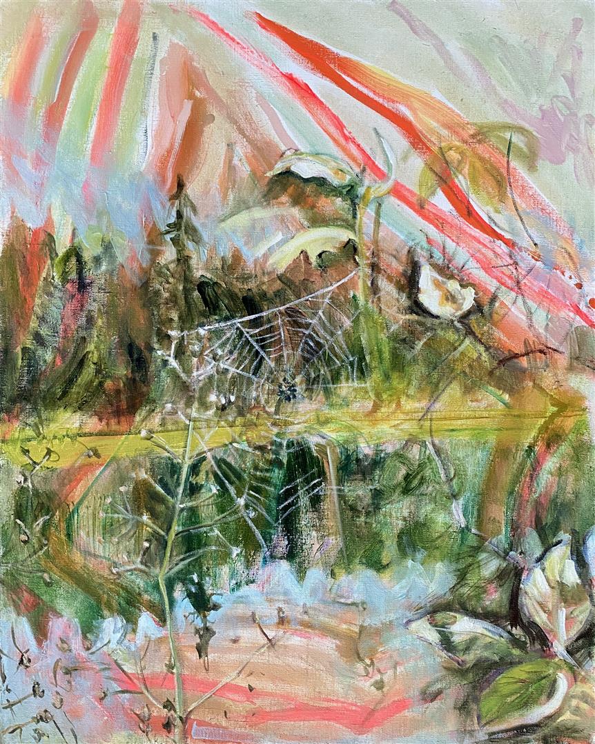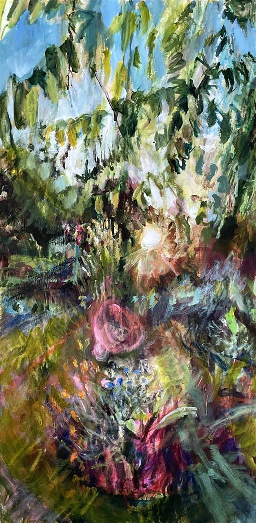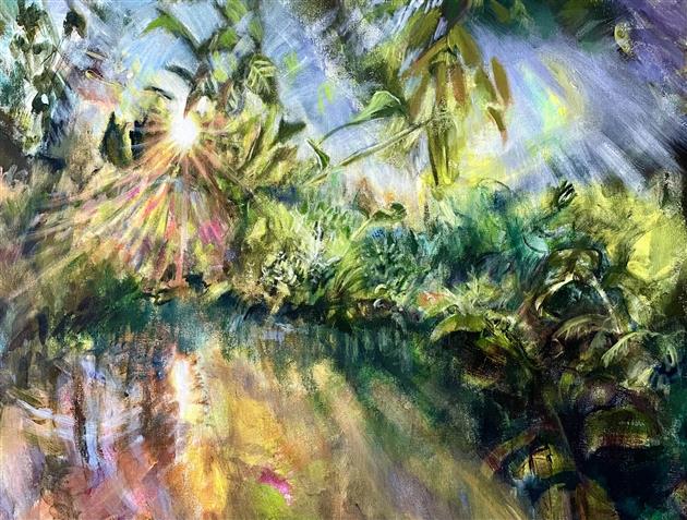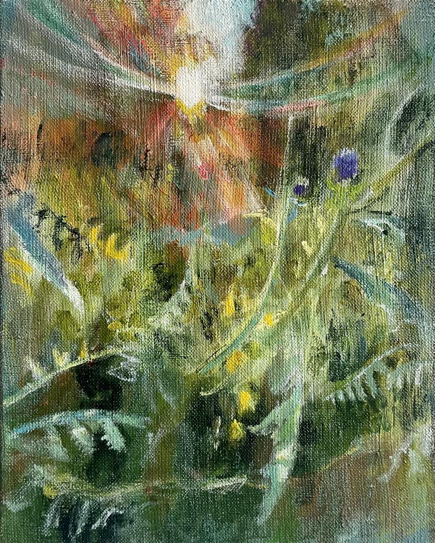 My paintings are derived from images of my backyard or nearby PNW forests and waterways made whimsical through the filter of my mind and memory. I'm constantly adding to the collection of personal sun-soaked moments that arrest me upon encounter and, as I tend to them in my studio, I aim to capture that pause and extend it. The more my landscapes look like a projection of a segment of a dream, the more a sense of time is infused in the canvas. I approach this with fantasy-based color combinations and specific mark-making. With blurred edges and suggestive forms, my pieces take on an abstracted quality that allows for time and gives space to dreams.