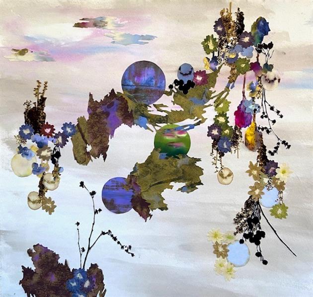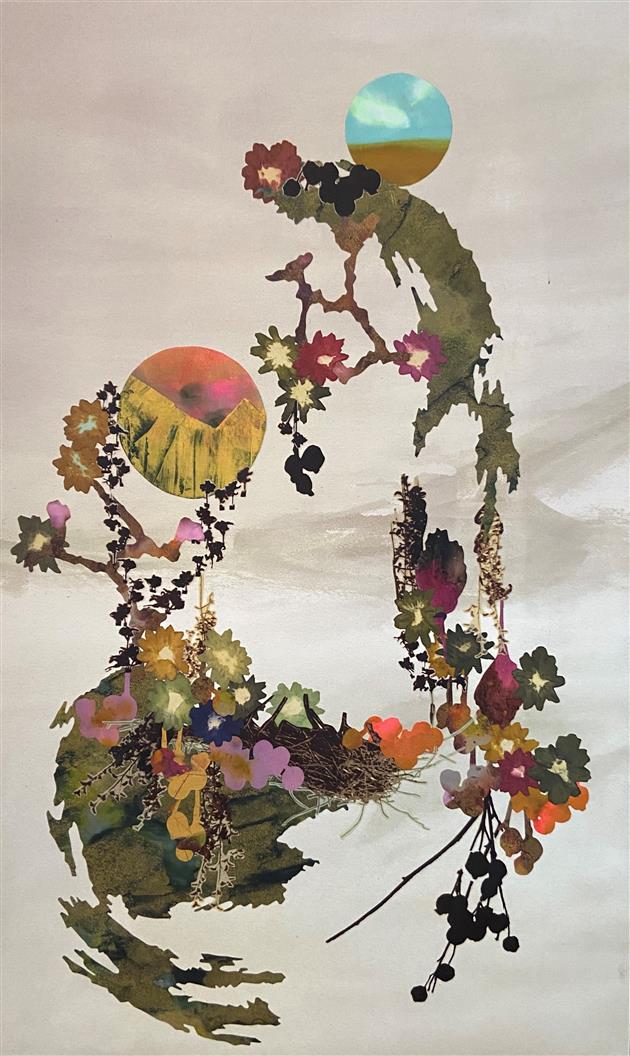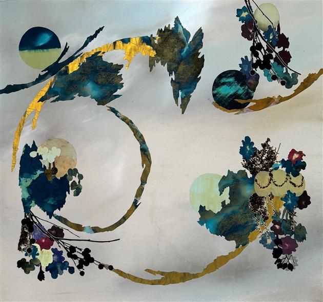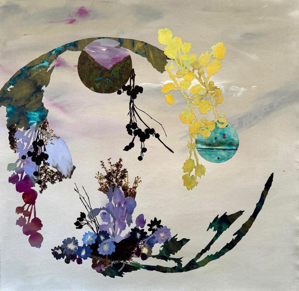 These landscapes are not recognizable as particular geographic places Rather, they are fragments of nature and human existence recomposed as scenes, as mind and memory build associations: an arc of earth holds continents of flowers and rich soil and a reaching hand. These are not renderings of an actual landscape, but reimagining's that incorporate both randomness and narrative. Based in the current global environmental crisis, this body of work is a poetic demonstration of the beauty of the Earth and human responsibility. Utilizing Van Dyke printed photography, thread, ink, dye, and wax, the fiber is rubbed, embroidered, silkscreened, painted and printed.